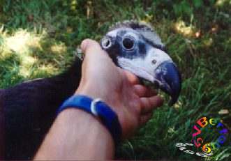 Ce jeune Vautour, Léo, avait été élevé à la main (ici la mienne qui n'a élevé que sa tête...) et était destiné à partir dans une volerie. |